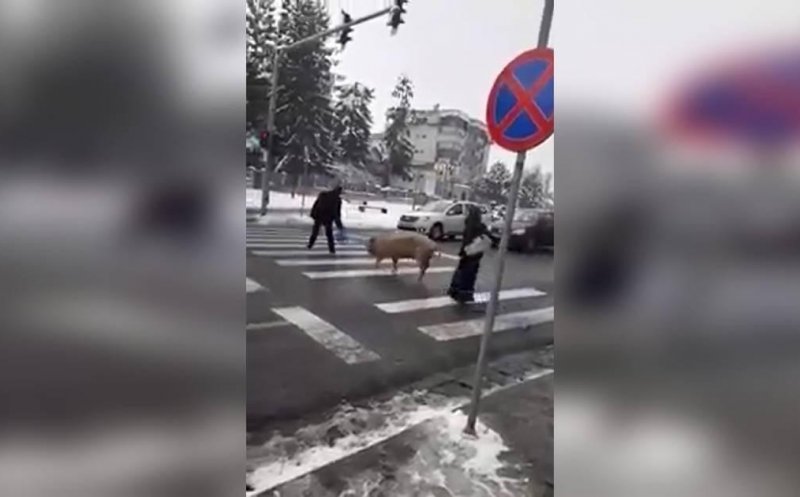 Locuitorii din oraşul Huedin, judeţul Cluj, au avut parte de un spectacol pe cinste pe o şosea din centru. Un cetăţean a ieşit cu porcul la o plimbare pe stradă, în plină zi, şi l-a învăţat cum e cu traversarea regulamentară.