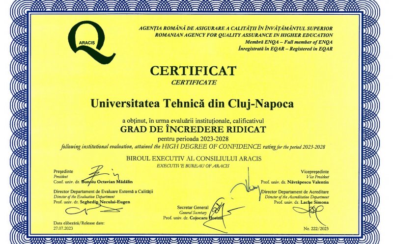 Certificatul a fost acordat pentru perioada 2023-2028 de către Agenția Română de Asigurare a Calității în Învățământul Superior (ARACIS) și înmânat personal domnului Rector, Prof.dr.ing. Vasile Țopa, de Președintele ARACIS, domnul Conf.dr.ing. Bunoiu Octavian Mădălin, în cadrul ședinței Senatului Universității Tehnice din Cluj-Napoca, care a avut loc joi, 14 decembrie 2023.
