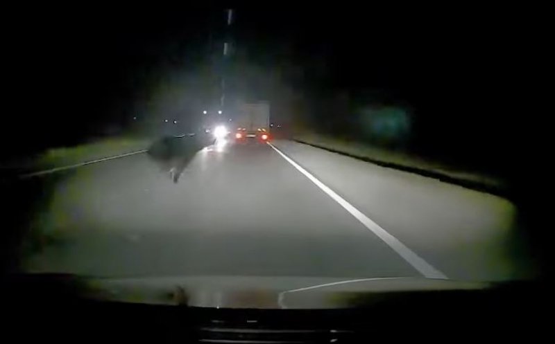 O cameră de bord a înregistrat momentul în care ursul apare brusc în fața mașinii și se izbește violent de aceasta: