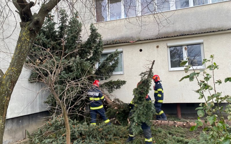Un brad s-a rupt și a căzut, în cursul zilei de luni, din cauza vântului, peste fațada unui bloc de pe strada Anina. Pompierii au intervenit și au tăiat bradul pentru a-l lua de acolo.