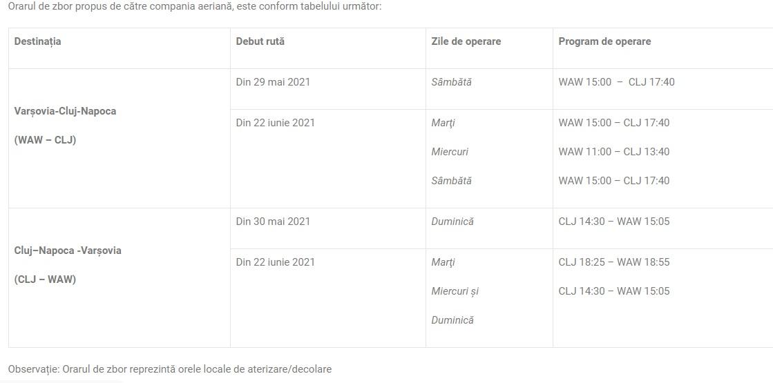 Zborurile spre destinaţia Varşovia vor fi operate pentru început cu o regularitate de 1 frecvenţă/săptămână, urmând ca din 22 iunie, zborurile să fie efectuate cu 3 frecvenţe/săptămână, până la finalul sezonului de vară 2021.