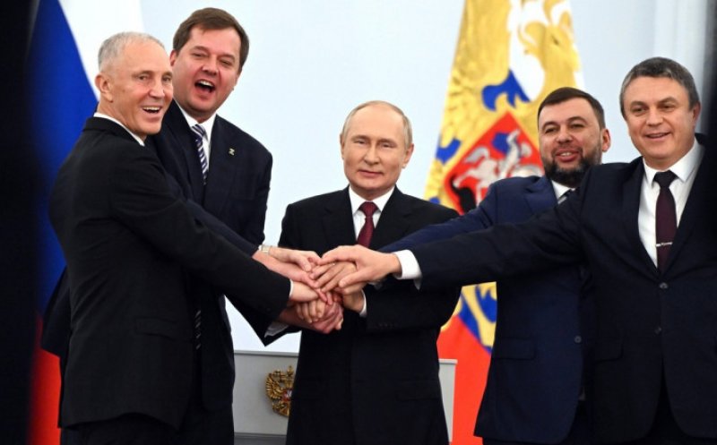 Vineri, Putin şi şefii celor patru regiuni au semnat tratatele de aderare a acestora la Rusia în cadrul unei ceremonii găzduite de Kremlin. Anterior, aceste regiuni au organizat referendumuri în care majoritatea covârşitoare a alegătorilor au optat pentru aderarea la Rusia.