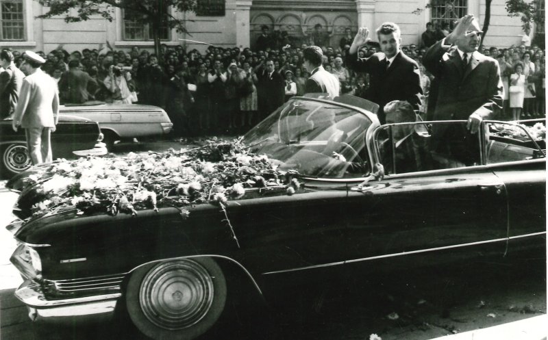 Mașina în care se afla acesta, cu capota încărcată de flori ca la nunta celor mai bogați din sat, sosea la sediul central al universității clujene, în aplauzele celor strânși la fața locului. Capota mașinii și carosabilul erau acoperite cu florile aruncate de pe margine de oamenii adunați. Nicolae Ceaușescu saluta mulțimea din decapotabilă, asemenea unui Kennedy autohton, dar, totuși, comunist, în ciuda simbolului capitalist care îl plimba.