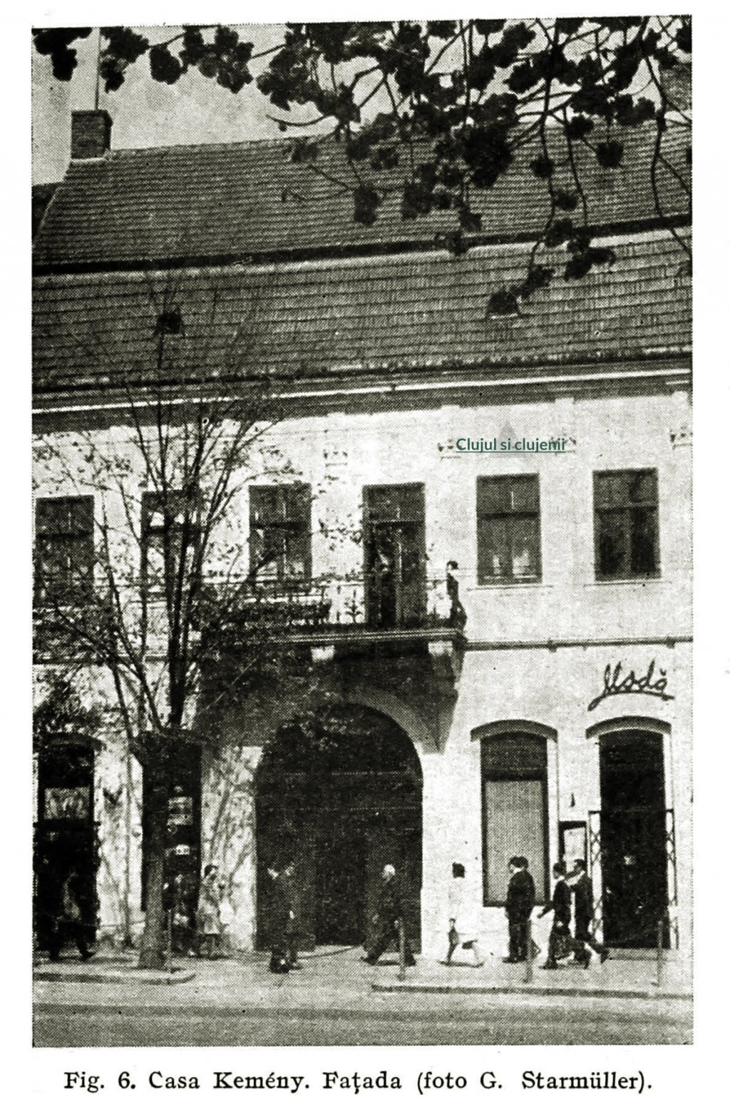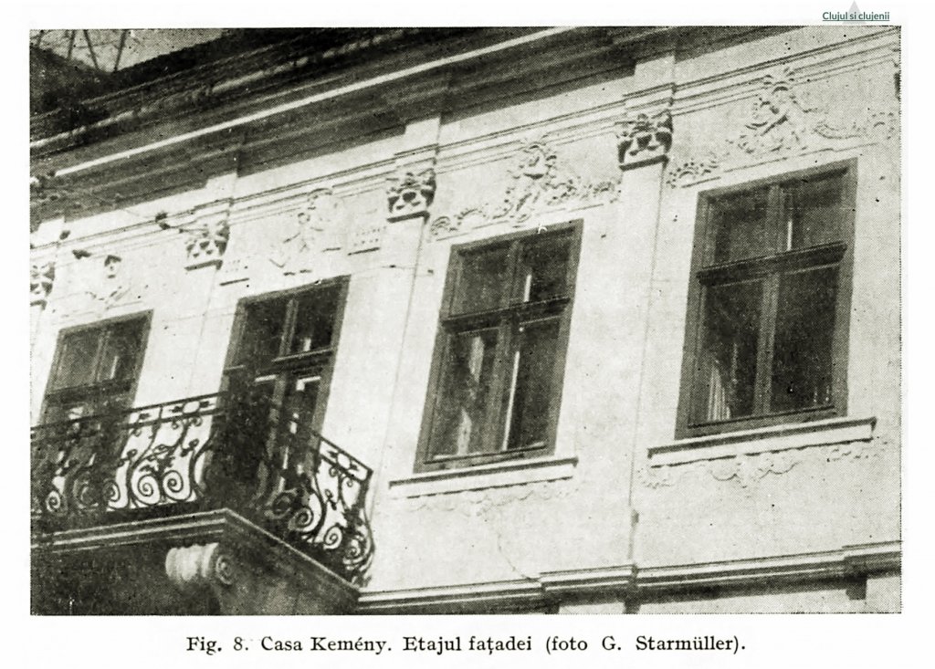 Urmărind mai departe monumentele din grup în ordine cronologică, sesizăm pe de o parte că sistemul construcţiei, compunerea maselor şi dispunerea spaţială, cu excepția unor adaptări la care obligă terenul, rămîn neschimbate, iar pe de altă parte faptul că în privinţa elementelor de articulare și decor se poate sesiza o devenire a formelor. Lucrul care se remarcă în primul rînd este atenuarea rezalitului central din care la casele Kemeny (Piaţa Libertăţii nr. 27), 'Thoroczkay (str. Făcliei nr. 10), Prefectura veche (str. Kogălniceanu nr. 6), casa mică Bânffy (str. Dr. Petru Groza nr. 32) nu rămîne decît balconul, în timp ce la casele Knoblauch (str. 30 Decembrie nr. 22), Tisza (str. 6 Martie nr. 34), Szatmâry (str. 6 Martie nr. 17) etc. portalul intrării se detașează foarte uşor din planul peretelui. În cadrul primului grup, alături de menţinerea balconului, notăm prezenţa, în registrul superior al fațadei, a unor bogate capiteluri compozite care amintesc prin plastică și tratare incizivă de cele de la palatul Bânffyi!. Rolul acestor capiteluri în conferirea unor efecte plastice pitorești fațadei este clar și tot un asemenea rol îl are și decorul, de forme diverse, din coronamentul ferestrelor etajului superior, apărut la monumentele din acest grup sub influenţa rococoului. La casa Kemeny (fig. 6), în coronamentul ferestrelor din dreapta și stinga balconului se află cîte un putto, între ghirlande bogate, sinuos mişcate, iar deasupra ferestrei şi ușii balconului se află, în relief plat, cu conturele incisiv marcate, un bust de bărbat cu coif între două turnuri de cetate şi respectiv un tînăr (foarte stingaci tratat) cu spadă şi coif, ieșind dintr-un cort militar aflat între două case