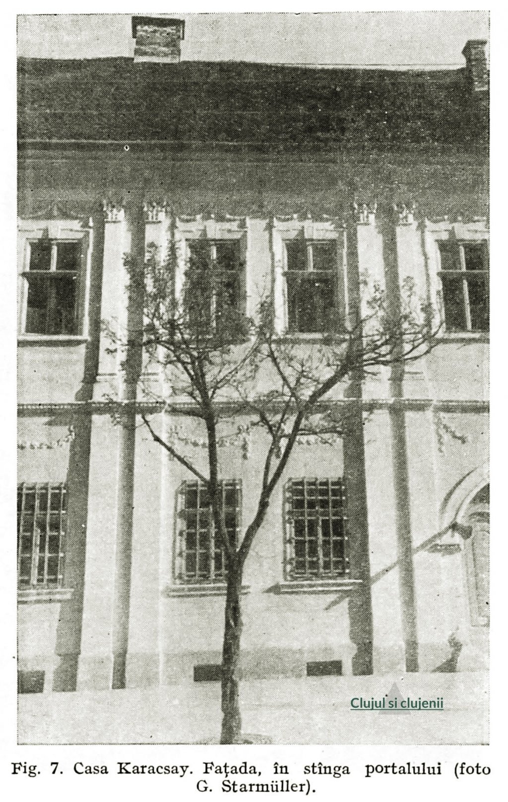 cu un etaj. O săgeată sub bustul bărbatului şi o secure alături de tînărul cu spadă completează cele două coronamente a căror tematică ni se pare greu de explicat. Sub pervazul ferestrelor din afara balconului se află decoruri cu elemente vegetale, urmînd un traseu sinuos (fig. . La casa Karacsay (fig. 7), în portiunea originală a faţadei, deasupra ferestrelor de la parter se află cîte o ghirlandă bogat profilată împodobită la capete cu panglici care coboară vertical. La etaj, deasupra fiecărei ferestre, se află cîte două ghirlande susţinute în capete de cîte un porumbel în zbor şi atîrnate la mijloc, prin intermediul unei rozete, de ciubucul care se află deasupra pilaştrilor . La ambele registre decorul este plastic tratat, are forme consistente şi se detaşează efectiv din planul peretelui. Faţada prefecturii vechi (fig. 9) are de asemenea deasupra fiecărei ferestre în registrul etajului un decor format dintr-o ghirlandă cu valoare plastică evidentă, al cărei desen este capricios, dar simetric şi care se termină într-un motiv de frunze mari striate si aplatizate. Un decor de ghirlande în relief relativ accentuat se află de asemenea în coronamentul ferestrelor etajului la casa mică Bănffy (fig. 10, 11), amintind prin traseu şi consistenta formelor pe cel de la casa Karacsay si casa Szatmăry. ln schimb la casa Szilvassy de pe calea Moţilor nr. 4 (fig. 12), ulterioară clădirilor enumerate mai sus, decorul - în formă de scoică în coronamentul celor trei ferestre centrale şi vegetal şi floral în coronamentul celorlalte patru ferestre - se aplatizează şi nu iese din planul peretelui, fiind incizat în masa tencuielii. Cu toate acestea faţada are un pronunţat aspect pitoresc datorită supleţii specifice rococoului, atenuată deja de orientarea spre clasicism, la decorul ferestrelor laterale cît şi datorită strierii orizontale, la ambele nivele, a pereţilor articulaţi la etaj cu pilaştri plaţi. Se poate observa cu uşurinţă în această succintă descriere a faţadelor că există o efectivă diversitate a formelor în cadrul barocului tîrziu clujean, fapt care trebuie pus în legătură cu cerinţele familiilor nobiliare care comandau clădirile, cît şi cu formaţia specifică a diferiţilor meşteri. Făcînd abstracţie de relativa diversitate a decorului din coronamentul ferestrelor, atenuarea rezalitelor intrării si treptata aplatizare şi simplificare a elementelor de articulare se poate urmări pe etape de la palatele Banffy şi Teleki la casa Szatmary, unde pilaştrii lipsesc la parter şi la casa Tisza, unde întregul aspect al faţadei este deosebit de auster, dovadă că aceste monumente se resimt deja, cel puţin ca spirit, de influenţa noii faze stilistice care începe să se impună: clasicismul.