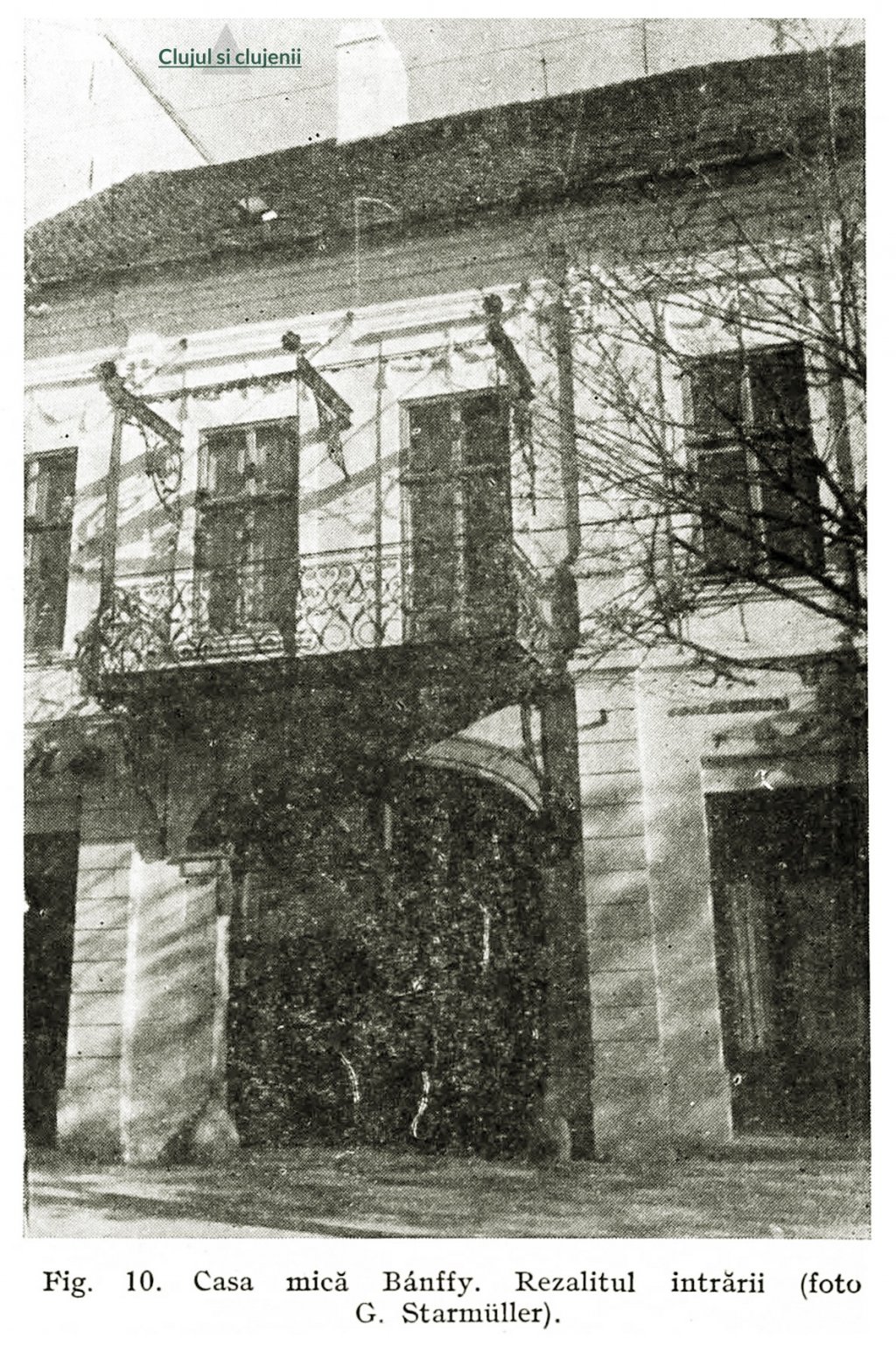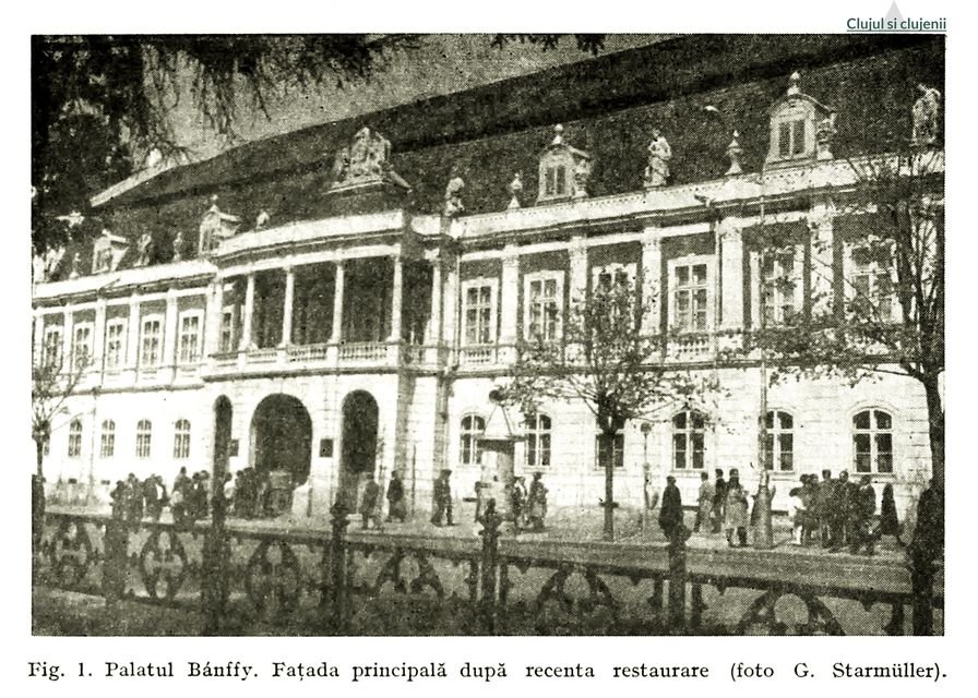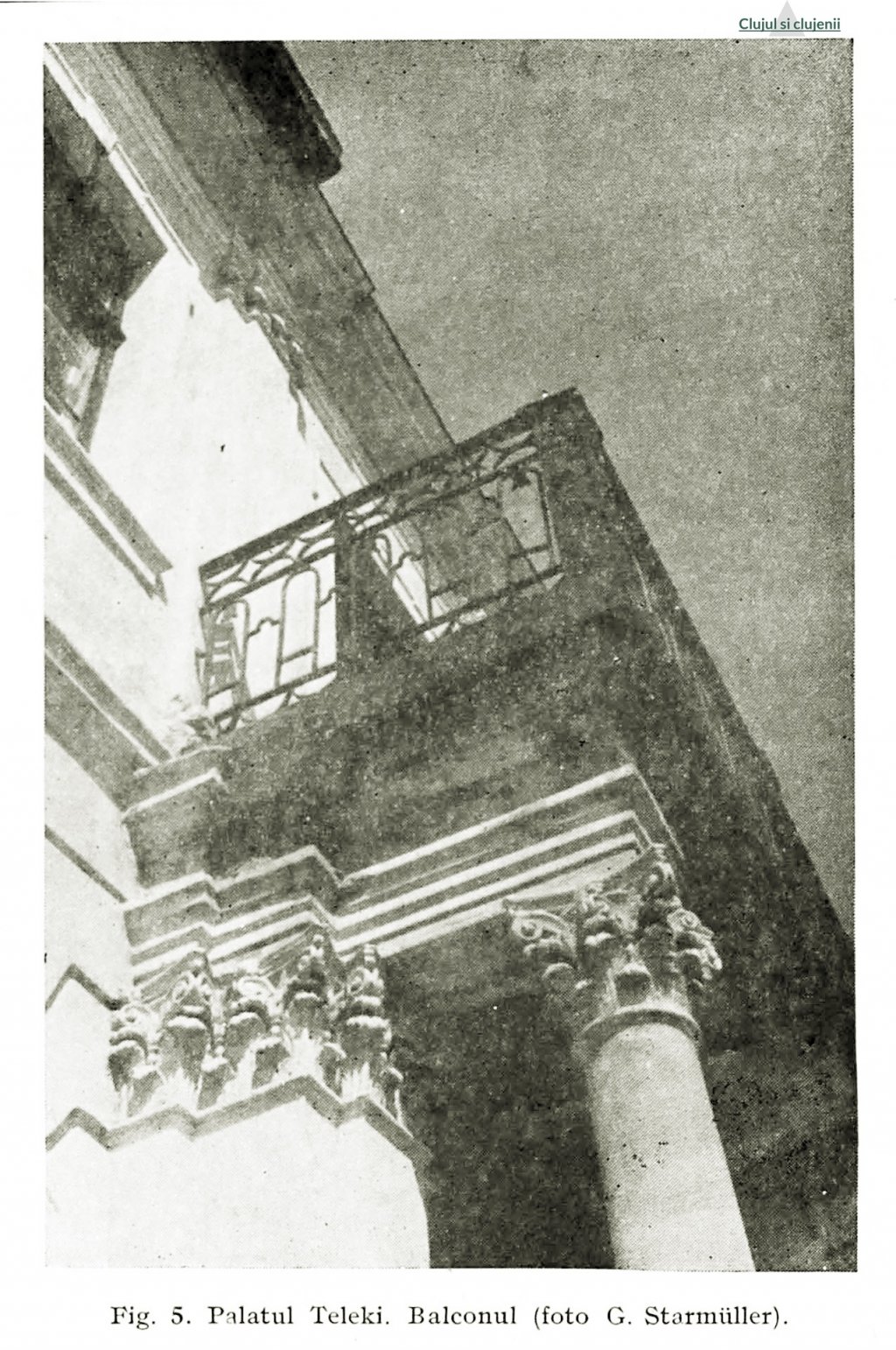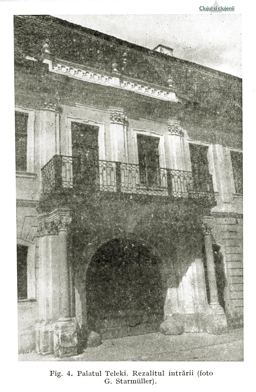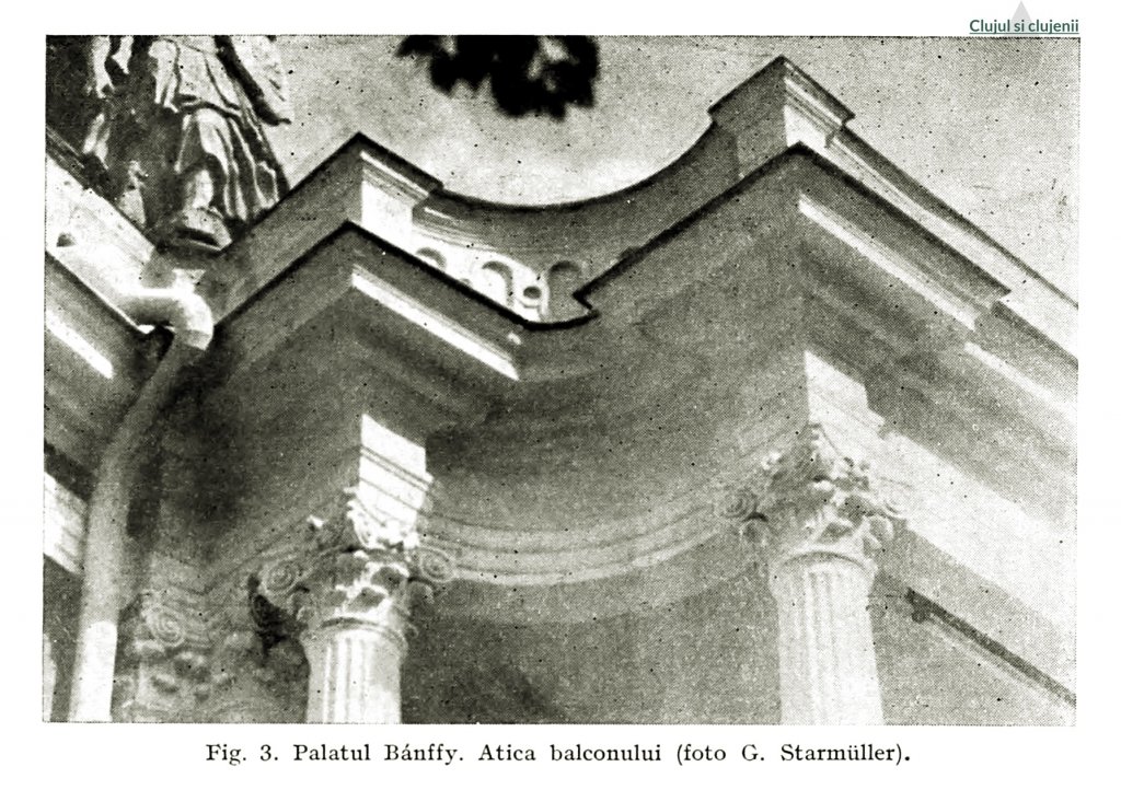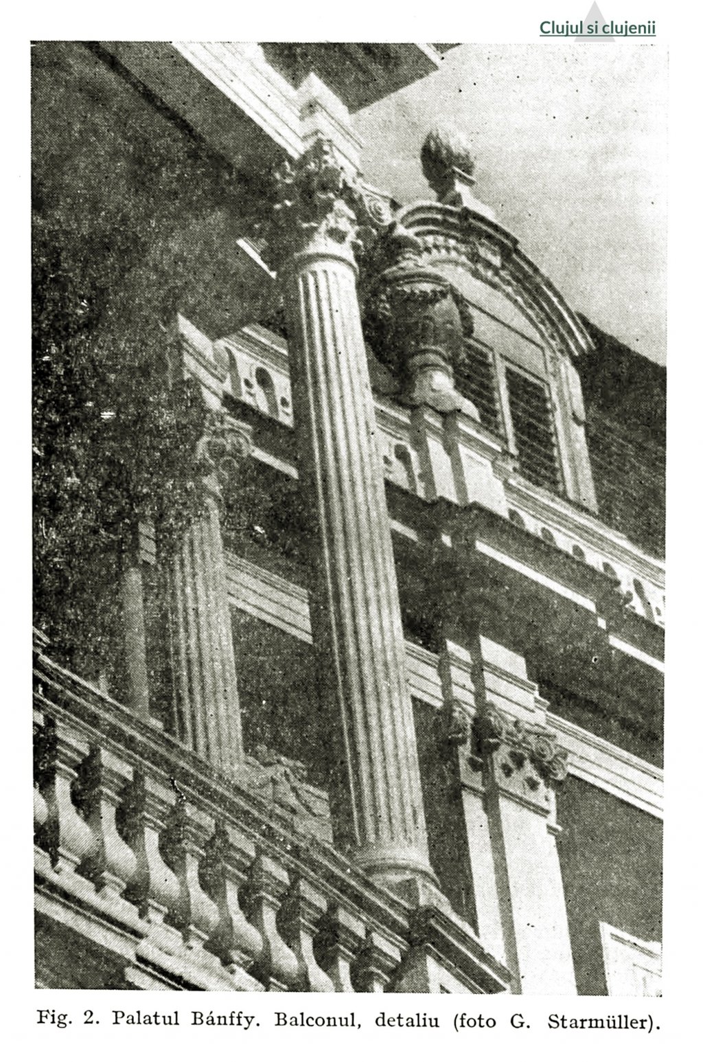 Toate aceste elemente îmbracă însă la fiecare monument forme concret diferite, ceea ce sporeste caracterul pitoresc al ansamblului. în plus, în cadrul multor clădiri din grup, deasupra ferestrelor etajului şi, la citeva, deasupra ferestrelor parterului se află decoruri de ghirlande împletite in forme de o mare diversitate. Toate elementele de articulare si de decor ies clar în relief din planul peretelui. Aceasta, ca şi incisiva tratare a detaliilor, se face premeditat în scopul obţine ii unor efecte plastice cit mai puternice, sporite de efectele de lumină si umbră care se obţin în cursul zilei pe faţadă. • • Primul monument din serie, cel mai important prin dimensiuni şi valoare artistică, este palatul Banffy (azi palatul Muzeului de artă din Cluj, Piaţa Liberăţii nr. 31) care aparţine deja prin soluţiile adoptate şi prin spirit barocului tîrziu. Faţada principală (fig. 1) este dominată de masivul rezalit arcuit, corespunzînd intrării principale în palat, rezalit care susţine la etaj un balcon acoperit care încadrează cele patru axe centrale. Spre stradă balconul are o balustradă (fig. 2) pe care se află sapte coloane zvelte, canelate, cu capiteluri compozite care sus in atica .(fig. 3) şi acoprişul balconului încoronat cu o masivă stemă a famili ei Banffy sculptată în piatră, în stinga şi dreapta acestui motiv central se suie, despărţite de pilastri dubli, ferestre termonate • în segment de arc• la parter, dreptunghiulare, cu colţurile uşor evazate şi cu bolţarul median marcat si decorat• la etaj. Un ciubuc puternic între parter şi etaj, accentuat de dispunerea. sub pervazul ferestrelor etajului a unor parapete din baluştri, cît şi puternica cornişa care susţine o balustradă cu motiv de panglici împletite, au menirea să confere faţadei un accent orizontal puternic pe care îl întrerupe însă rezalitul intrării şi articularea pereţilor cu pilaştri dubli. Această dispunere a elementelor de articulare este conformă spiritului barocului ajuns în faza sa ultimă, cînd obţinerea unor anumite efecte pitoreşti face parte încă din programul estetic al stilului. Tot pe această linie, a obţjnerii unor efecte pitoreşti, dar şi in dorinţa de a etala preferinţele artistice, cît şi ca o dovadă a unor mari resurse materiale se înscrie şi dispunerea pe balustrada acoperişului a unor statui de zei antici şi urneori. aglomerarea în faţadă a unui număr mare de elemente de articulare şi decor este evidentă şi conformă, cum s-a văzut, dorinţelor celui care a comandat palatul. Lucru. remarcabil, ordonarea acestor elemente conferă faţadei un aspect fastuos şi monumental; nu lipsesc nici efectele voit pitoreşti realizate prin punerea în lumină favorabilă a volumelor şi formelor plastice de o anumită eleganţă voit distinsă. Servind ca punct de plecare şi ca model clădirilor care-i urmează în timp, realizarea faţadei palatului Banffy (ca de altfel şi organizarea interioară şi dispunerea maselor) se datoreşte în bună măsură talentatului arhitect şi sculptor Johann Eberhard Blaumann care a proiectat şi condus, între 1774 şi 1785, lucrările de construcţie, meşter care-şi depăşeşte net contemporanii şi pe care Biro J. îl socote pe pe bună dreptate ,,un spirit artistic elastic şi 1nspirat". Faţada palatului Bânffy a influenţat neîndoielnic asupra realizării celorlalte monumente din serie. Verificarea se poate face în cazul multora dintre clădirile clujene din perioada barocului tîrziu, dar ea este poate cea mai plină de semnificaţii analizînd faţada unui alt monument important: palatul Teleki (Str. Kogălniceanu nr. 9) construit mtre 1790-1795 de către arhitectul Joseph Leder. Motivul central al intrării este. şi în acest caz puternic marcat printr-un rezalit (fig. 4), realizat prin articularea portalului •principal cu o pereche de stîlpi masivi, bogat profilaţi, în corespondenţa cărora se află, la o distanţă de 0,5 m de planul clădirii, două coloane care, la fel ca şi stîlpii, au capiteluri compozite inciziv tratate (fig. 5). Pe aceste suporturi şi susţinut la mijloc de o consolă masivă afiată în continuarea bolţarului median al portalului principal, se află un balcon din dale de piatră cu grilaj de •fier forjat. Soluţia acestui balcon este minoră în comparaţie cu cea de la palatul Bănffy, dar o influenţă a acesteia din urmă se poate uşor sesiza în dublarea celor trei pilaştri din partea mediană a faţadei şi în prezenţa pe acoperiş, numai în porţiunea corespunzătoare rezalitului, a unei balustrade cu motiv de panglici împletite care susţine trei urne. In ansamblu, faţada palatului Teleki are neîndoielnic un anume echilibru, o anume distincţie pe care în cadrul grupului numai comparaţia cu palatul Banffy o poate umbri. Fără a cunoaşte o eleganţă a formelor şi un fast atit de accentuat ca la palatul Banffy, faţada palatului Teleki cunoaşte însă în principiu aceeaşi distribuire a accentelor orizontale şi verticale cît şi foarte asemănătoare folosire a ancadramentelor de la ferestre.