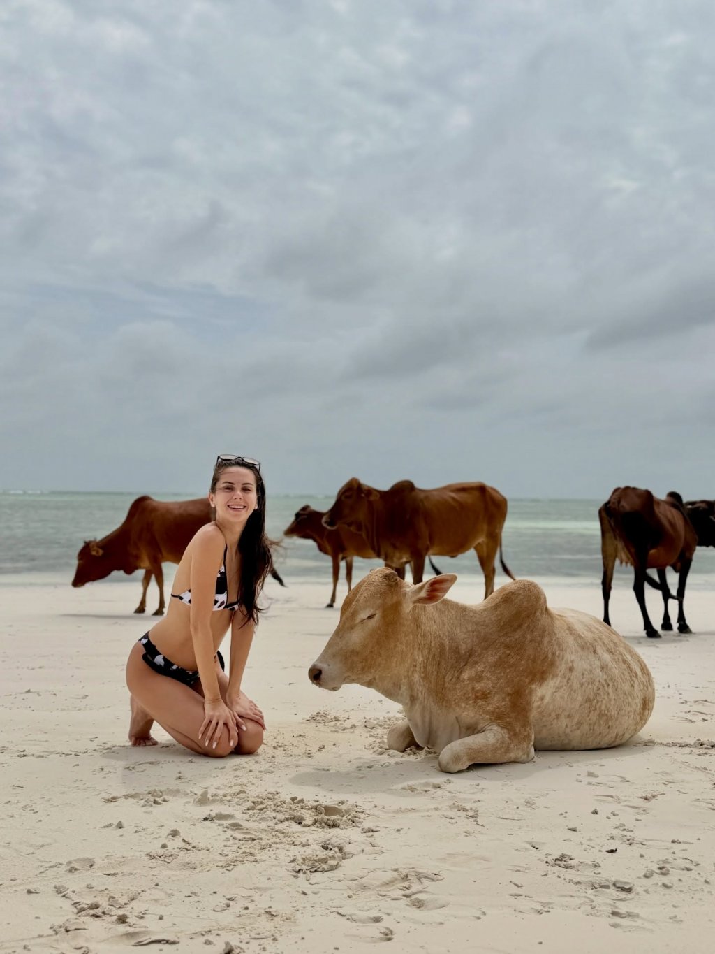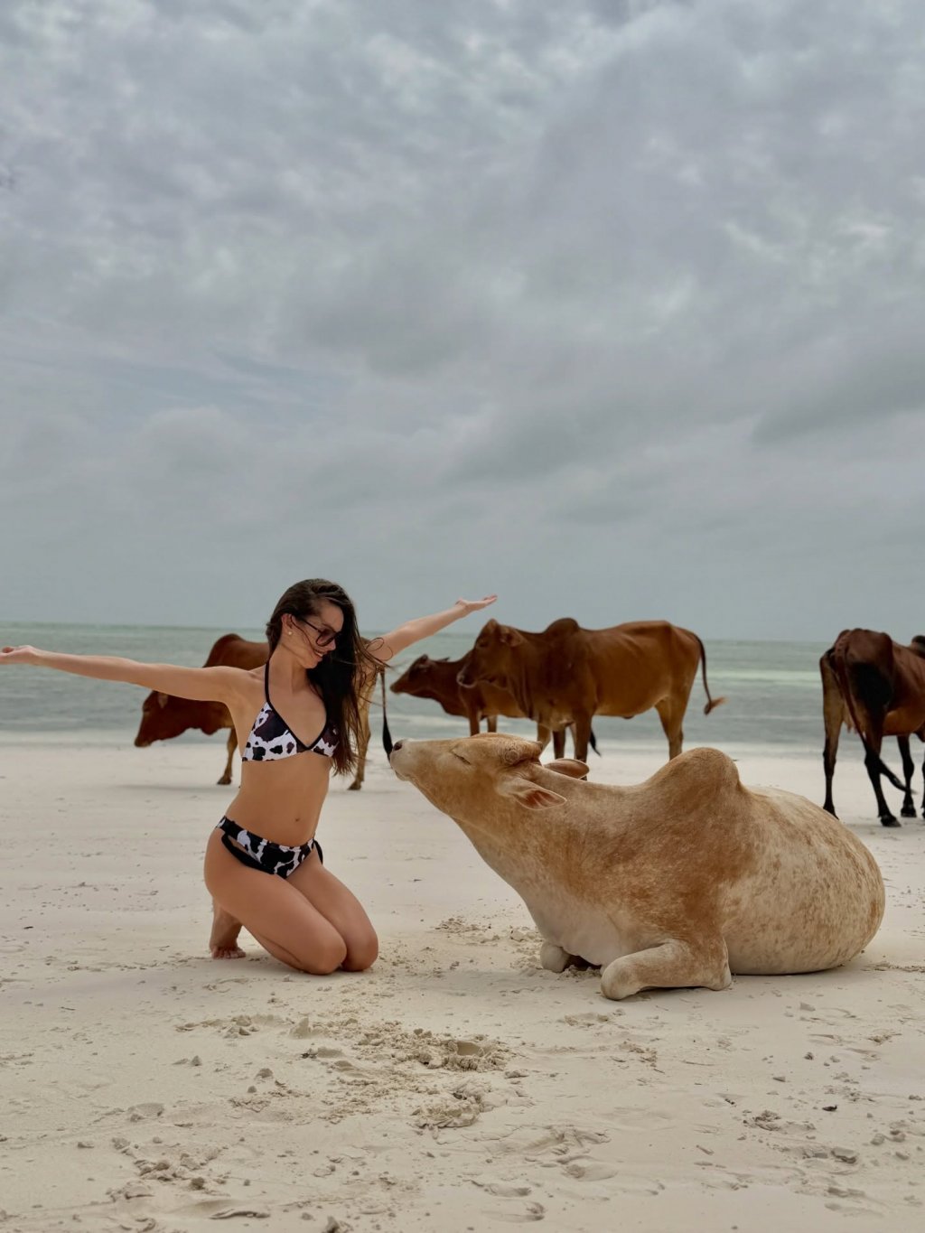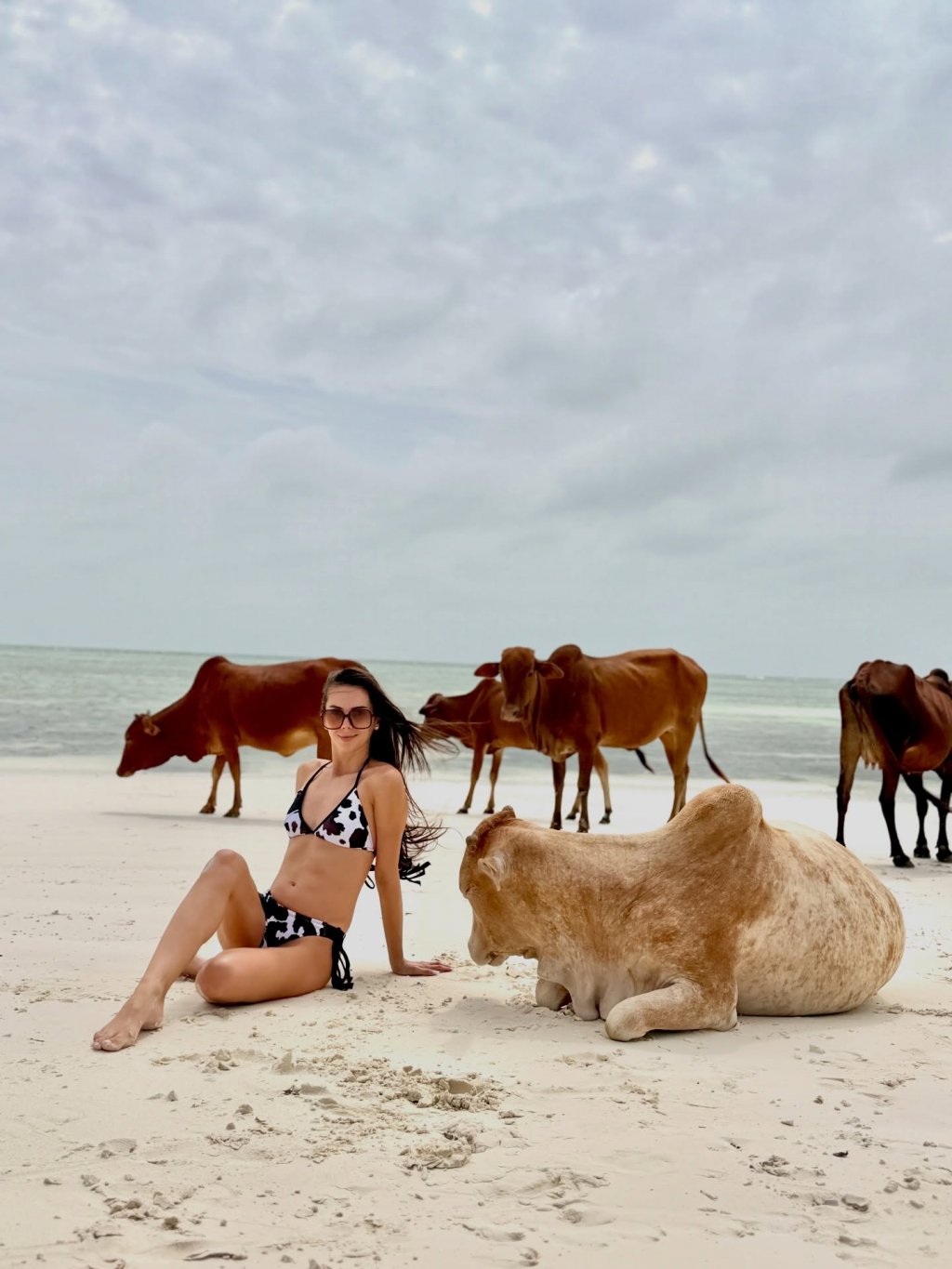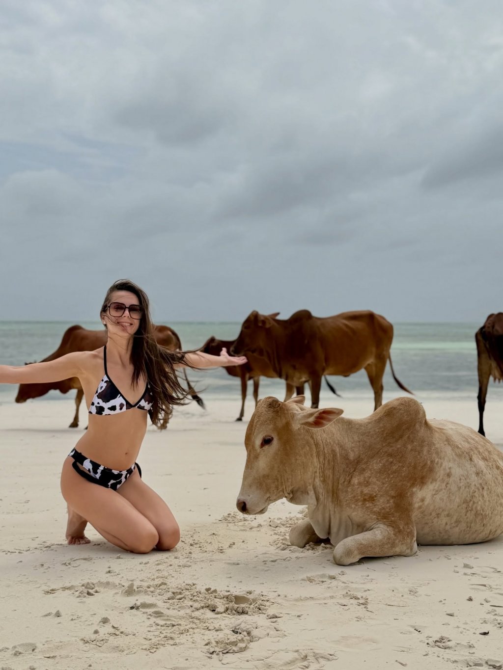 Georgiana Lobonț a ajuns în Tanzania în vacanță și și-a făcut o ședință foto cu o turmă de vaci pe o plajă în Zanzibar.