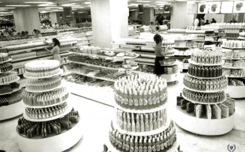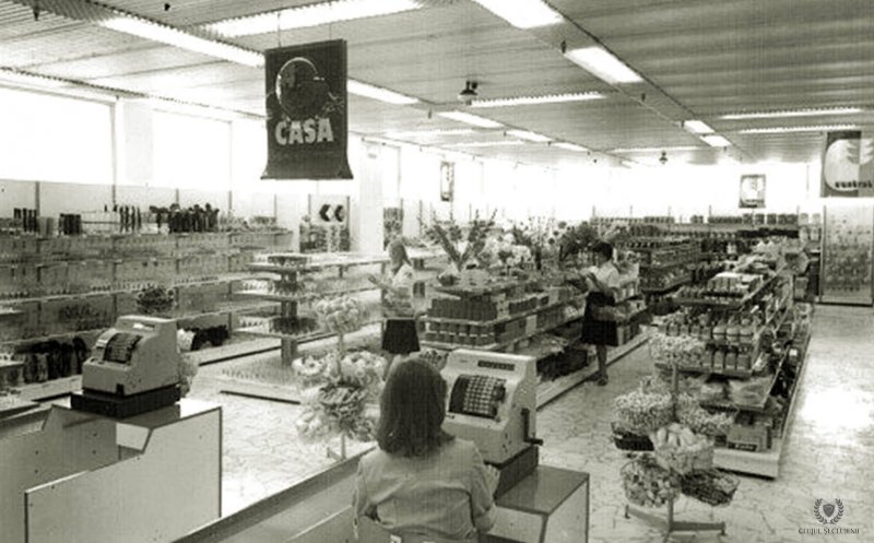 Magazinul ,,Central" cu Terasa de la etajul 3 și raioanele: Alimentara și Cosmetice de la parter, anii 1980. Ariva de fotografie: Clujul și clujenii