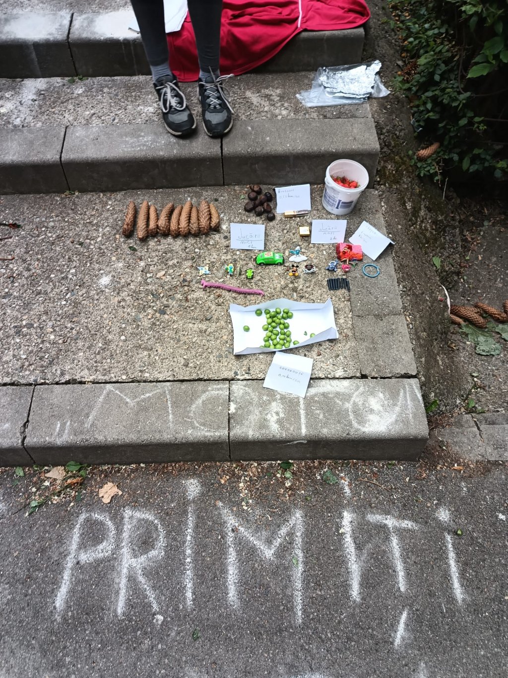 Pe marginea trotuarului şi-au instalat un magazin cu de toate: jucărele, conuri de brad, castane, căpşunei, corcoduşe acre foc şi ce au mai cules ei de prin casă sau ce i-a lăsat inima să aducă din cutiile cu jucării şi le-au scos pe "raft" la vânzare, adică pe treptele trotuarului.