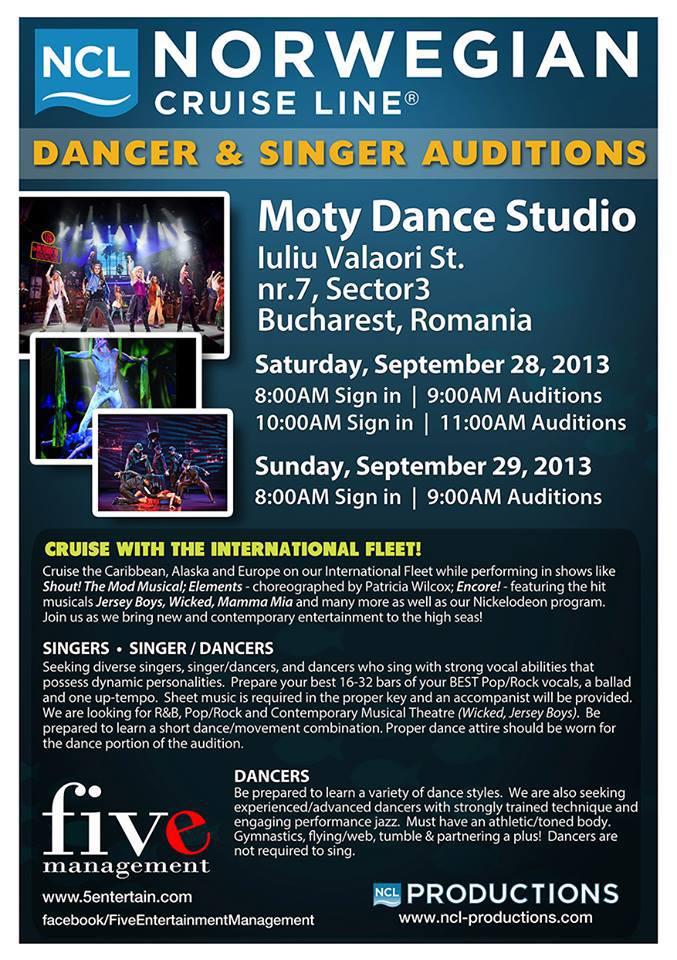 Evenimentul va avea loc la Moty Dance Studio, strada Iuliu Valaori nr. 7 ( Zona Unirii) pe data de 28 septembrie pentru dansatori, respectiv 29 septembrie pentru soliști vocali. Înscrierile se vor face începând cu ora 8:00, iar pentru detalii sunteți rugați să luați legătura cu reprezentanții Five Entertainment pe România - andra.fivemagency@gmail.com /www.5entertain.com.