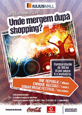 Tu reprezinți sursa noastră de inspirație pentru campania „Unde mergem după shopping?", care te va recompensa pentru că îți place shopping-ul de calitate, ești la curent cu toate tendințele din fashion și evenimentele inedite din oraș, citești mereu cărți și articole bune și asculți muzică live. Mecanismul este foarte simplu! Tot ce ai de făcut este să ne arăți că iubești shopping-ul la mall și poți să fii câștigător. Cumpără în perioada 10 - 26 octombrie 2014 din Iulius Mall produse în valoare de minimum 100 de lei, pe unul sau mai multe bonuri cumulate, și intră în posesia taloanelor de participare în campanie!