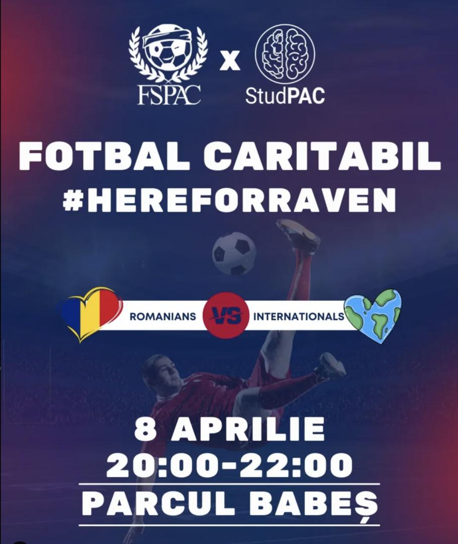 „Suntem alături de Raven! Anunțăm cea de-a patra ediție a meciului de fotbal caritabil dintre studenții români și cei internaționali pentru a strânge donații pentru Cosmina (Raven) care este studentă la FSPAC, specializarea Jurnalism engleză, anul 1 și este voluntar StudPAC. Fiecare donație primește prăjitură și băuturi fără alcool”, au transmis organizatorii.