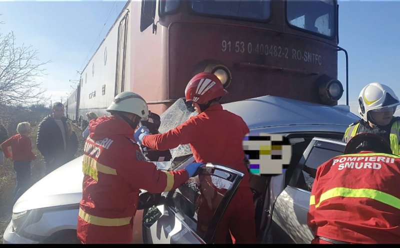 Foto Mașină SPULBERATĂ de trenul Cluj-Napoca - Galați. Șoferul autoturismului, transportat la spital cu elicopterul SMURD