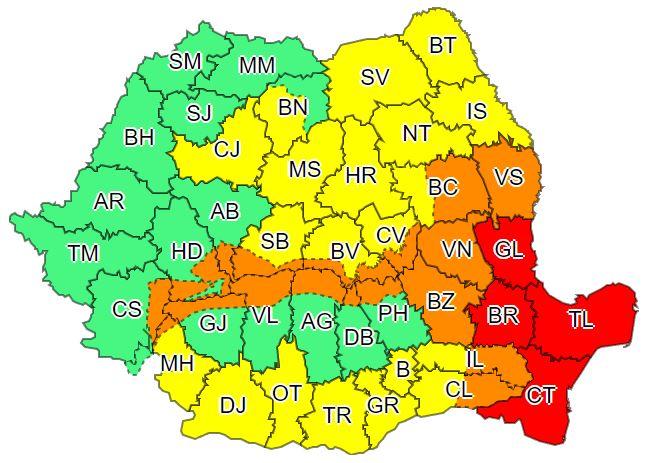 Reamintim că mare parte din țară se află sub atenționări de vreme severă. Au fost emise Cod Roșu, Portocaliu și Galben de vânt și viscol în mai multe zone, conform hărții: