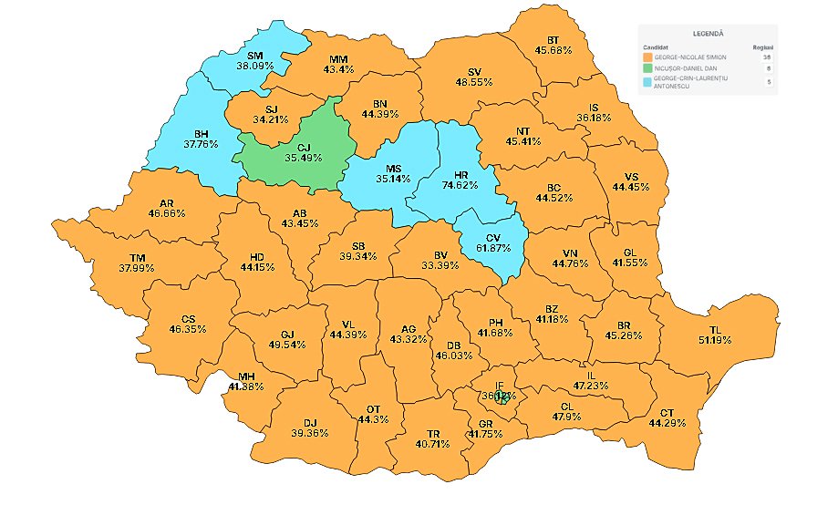 Dintre județele țării, Clujul este singurul care a votat în majoritate cu Niculor Dan. Crin Antonescu a reușit să aducă de partea sa 5 județe care l-au votat în majoritate: Bihor, Satu-Mare, Mureș, Harghita, Covasna. Restul de 36 de județe au votat în majoritate cu George Simion.