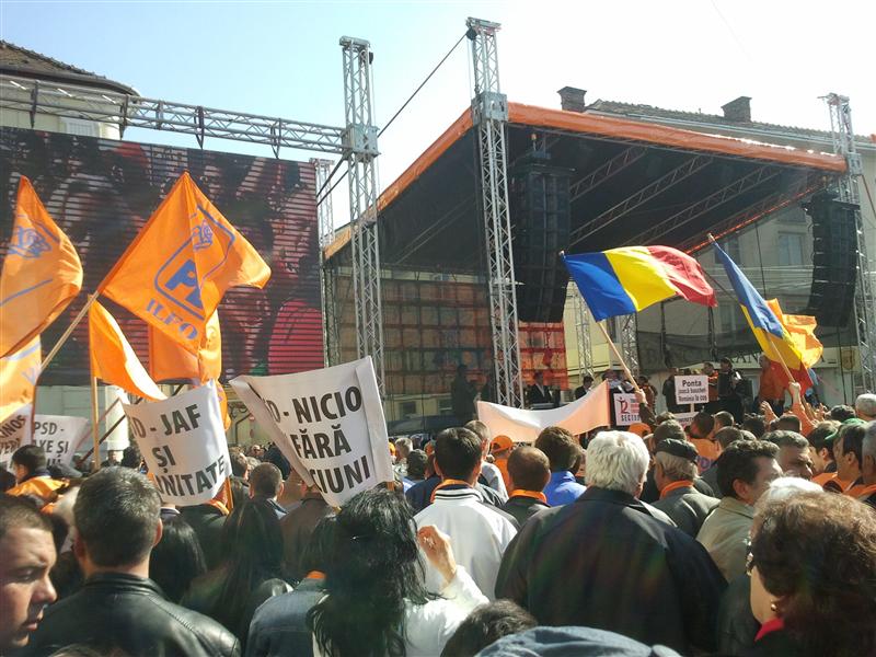 Participanţii la miting au venit din mai multe judeţe din ţară - aceştia au arborat pancarte pe care şi-au trecut judeţele din care vin - Suceava, Brăila, Satu Mare, Mureş, Iaşi, Bihor, Mehedinţi, Sălaj sau Olt - şi au agitat steaguri şi bannere pe care au scris "Constituţia USL - raiul infractorilor", "PSD - cel mai mincinos guvern", "Miniştrii USL, spaima puşcăriilor" sau "PSD taxe şi minciuni".