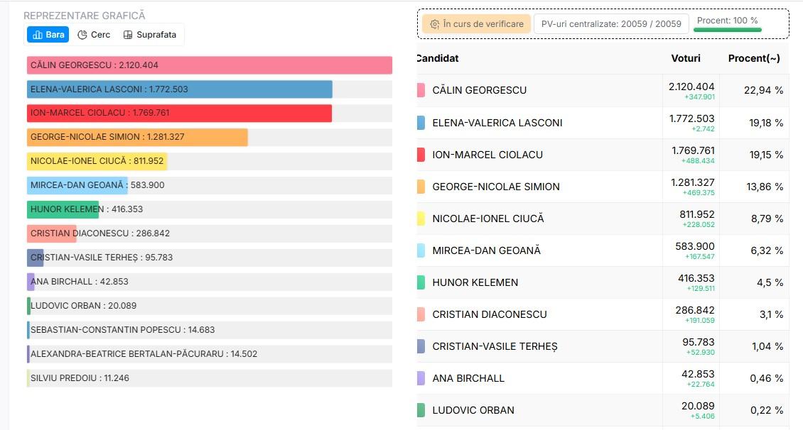 Breaking news Foto REZULTATE FINALE TUR I alegeri prezidențiale: CĂLIN GEORGESCU - 22,94 %, ELENA LASCONI - 19,18 % MARCEL CIOLACU 19,15 % / Situația pe Cluj