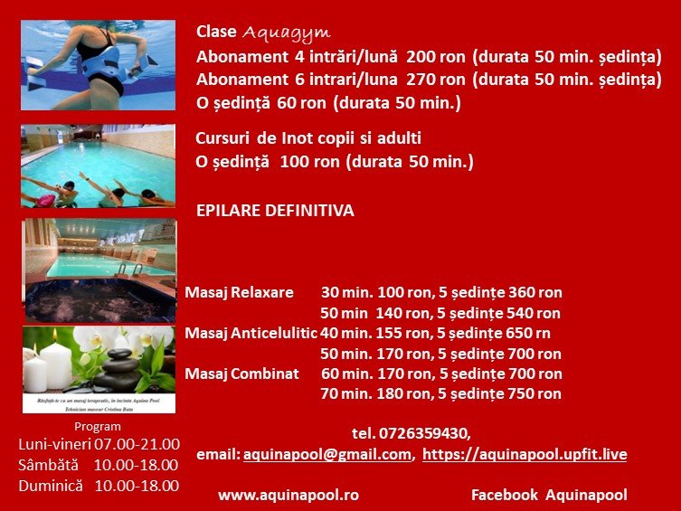 La Aquina Pool se organizează și cursuri de înot pentru copii și adulți, în grup de maxim 6 persoane, dar și clase de Aqua Gym și hidroterapie, adresate în special persoanelor care doresc recuperare, refacere, relaxare, susținute de antrenori cu o vastă experiență în domeniu. Accesul este permis minorul peste 4 ani, însoțiți de un părinte sau tutore.