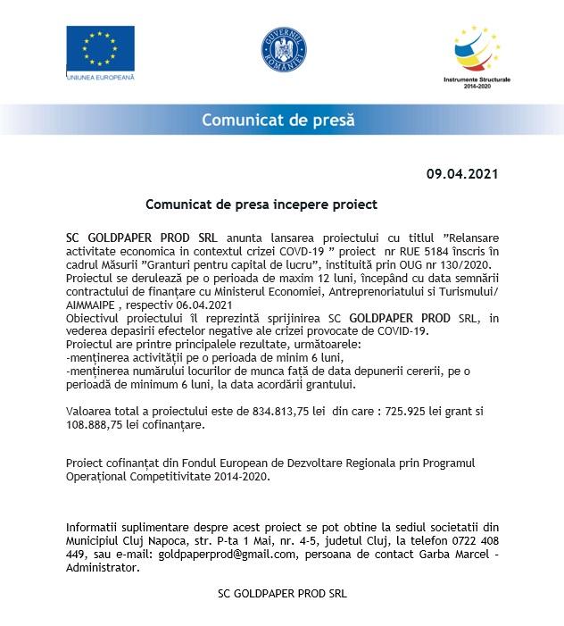 SC GOLDPAPER PROD SRL anunta lansarea proiectului cu titlul ”Relansare activitate economica in contextul crizei COVD-19 ” proiect nr RUE 5184 înscris în cadrul Măsurii ”Granturi pentru capital de lucru”, instituită prin OUG nr 130/2020.