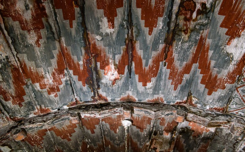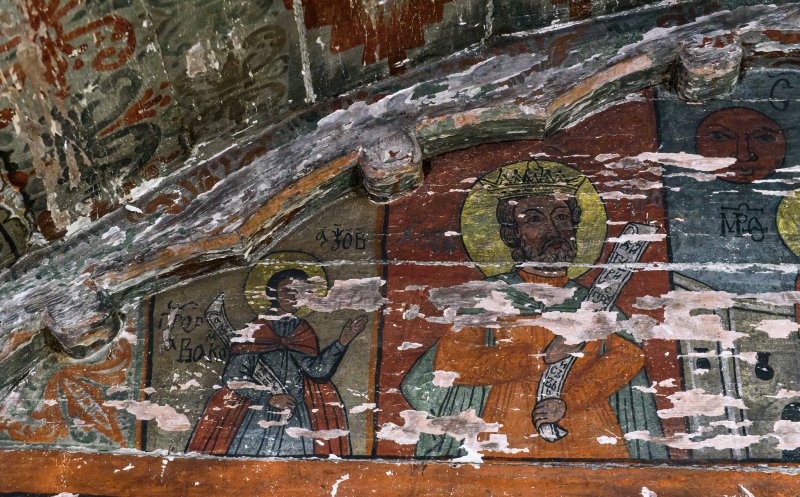 Iconostasul vechi, dovadă stând existența a doar două intrări, este pictat cu şirul celor 12 Apostoli și Iisus Arhiereu, registru încununat de o Răstignire, unde remarcăm soarele și luna, reprezentate în culori sângerii. În pronaos, Pilda fecioarelor și o friză a sfintelor mucenițe sunt puternic deteriorate.