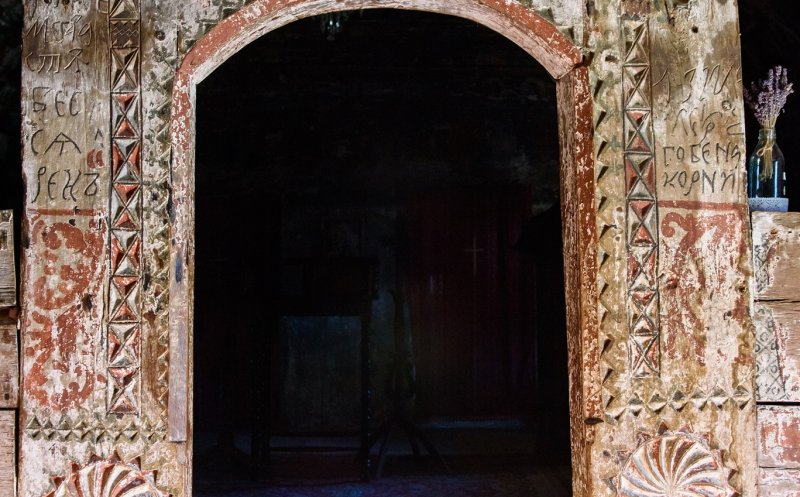 Meșterii, rămași anonimi, și-au dovedit talentul și în decorarea ancadramentelor de intrare în pronaos și naos, pe care au cioplit numeroase motive decorative, dintre care se remarcă rozetele morișcă, torsada și motivele geometrice. În acest fel, aceste intrări se constituie în adevărate praguri de trecere, încărcate de simboluri, potențate vizual de pictura care s-a mai șters în timp. Pe foaia ușii, la intrare, umbra pictată a unui Arhanghel Mihail, șters de vreme și de vremuri, întâmpină credinciosul.
