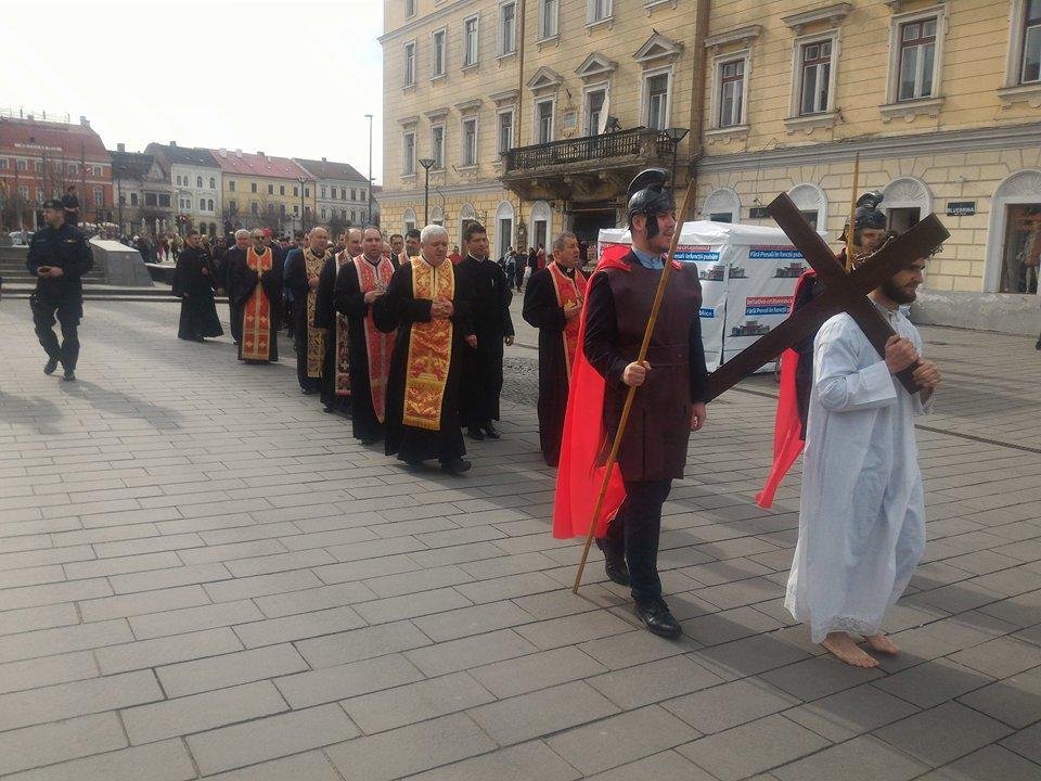 Participanţii la Drumul Crucii s-au adunat, miercuri, în Piaţa Unirii din Cluj-Napoca şi au pornit într-o procesiune pe Bulevardul Eroilor spre Catedrala “Schimbarea la faţă” intonând cântece religioase şi rugându-se. Un tânăr a purtat pe umeri o cruce din lemn şi l-a intrepretat pe Isus Hristos în timp ce era dus spre a fi răstignit, flancat de doi soldaţi romani.