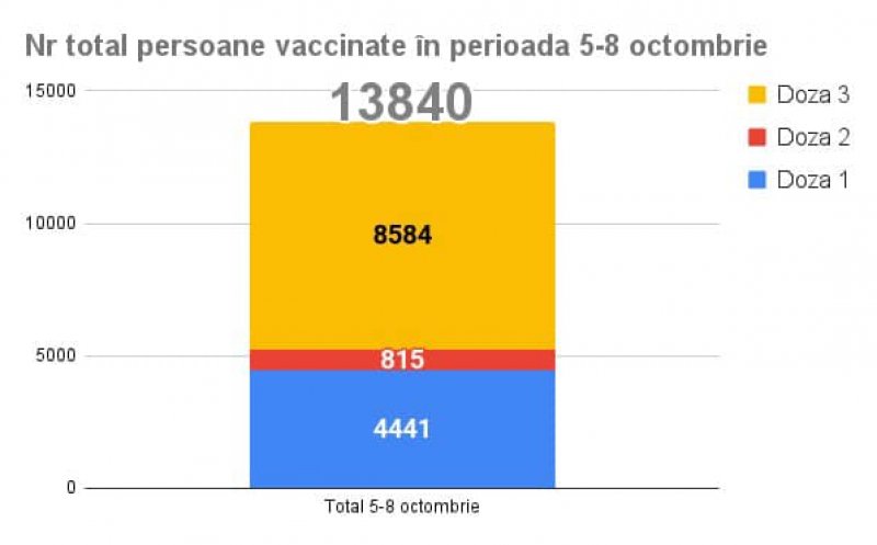 În perioada 5-8 octombrie, 13.840 de clujeni s-au vaccinat, dintre care 4.441 cu prima doză. Rata de vaccinare este de peste 53% și este în continuă creștere.