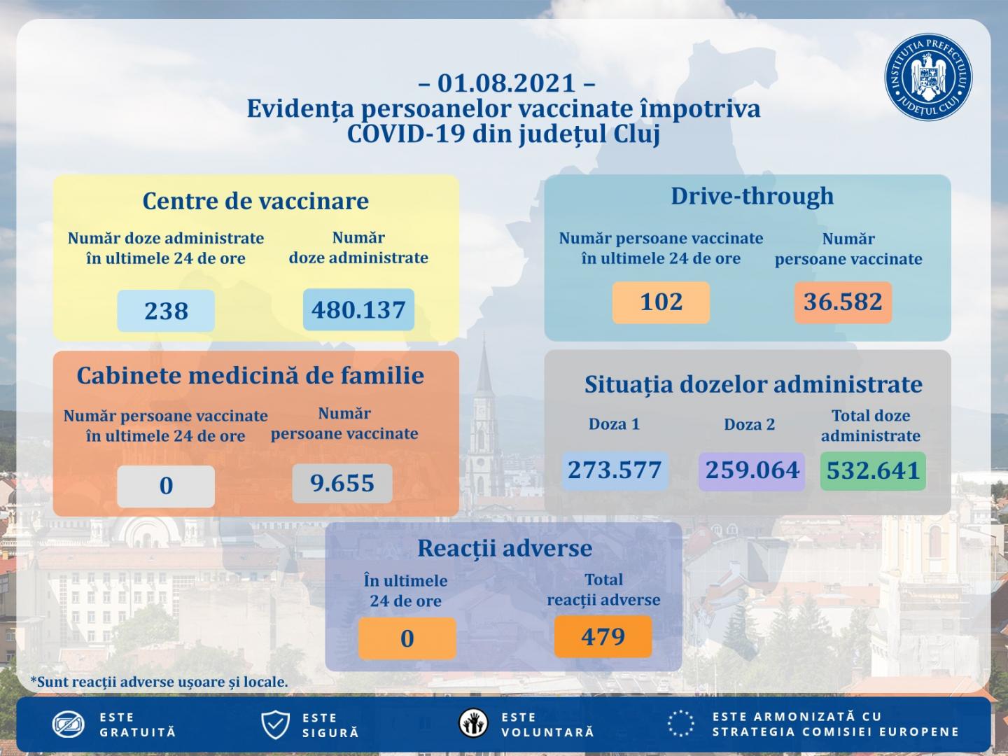 Din cele 340 de persoane care s-au imunizat în cursul zilei de duminică, 238 s-au vaccinat în centrele din județ și 102 de persoane au primit vaccinul direct în mașină, în centrul drive-thru de la Sala Sporturilor din Cluj-Napoca, unde s-a ajuns la un total de 36.582 de vaccinări.
