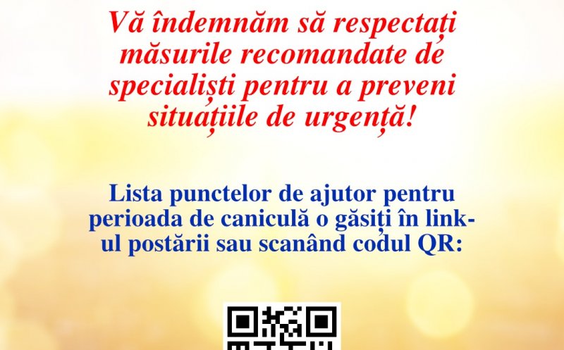 Pentru perioada de caniculă au fost stabilite puncte de prim ajutor în farmacii, în localitățile din județ, unde se va acorda asistență medicale de urgență, în limitele competențelor, va fi distribuită apă potabilă și, la nevoie, se va solicita intervenția echipajelor de salvare SAJ și SMURD.
