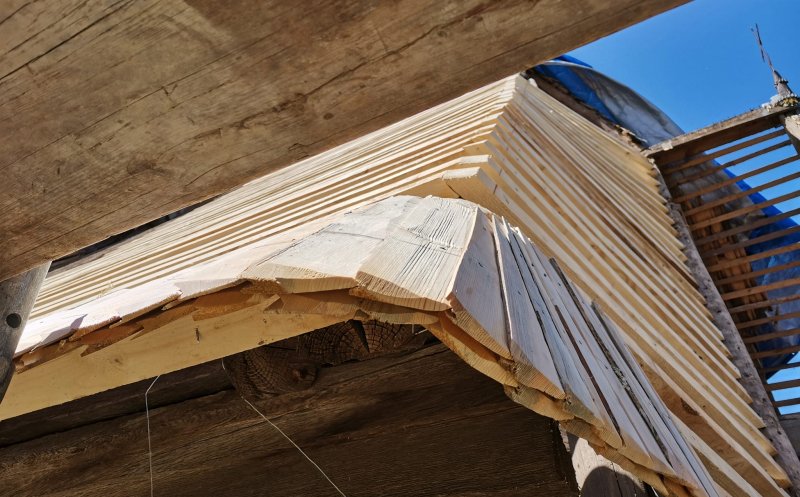 Ziua 2 - #voluntar pentru patrimoniu. Am aflat de la Eugen care e diferența între dranița, șiță și șindrilă, precum și sculele care se folosesc în meșteșugul tradițional. Am învățat de la meșterul Mihai cum se coplește cu baltagul și cum se bate șindrila pe colțul acoperișului, ba chiar am cioplit, bătut - prima dată-n viață - șindrilă pe colț.