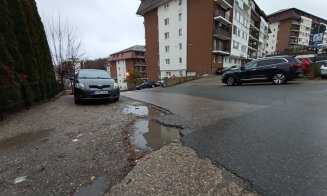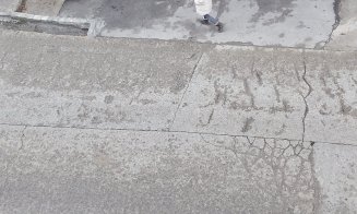 O stradă din Cluj-Napoca arată ca după bombardamente. Trotuarul este o capcană pentru pietoni, iar în dreptul staţiei de autobuz răsare un crater uriaş în beton.