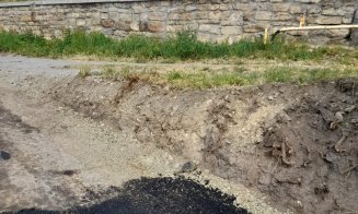 Cum se asfaltează la doi paşi de Cluj-Napoca: Gură de canal urcată pe "soclu" în mijlocul drumului