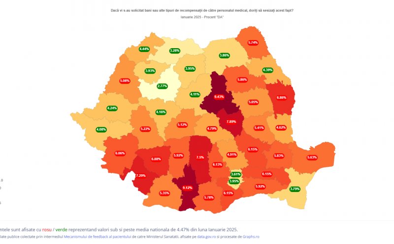 Procentul celor care spun că au dat şpagă a fost în decembrie 2024 de 4,21%, iar în ianuarie 2025 a urcat la 4,47%, susține Ministerul Sănătății. Datele sunt colectate şi puse pe platforma graphs.ro, fondată de clujeanul Dragoș Vana.