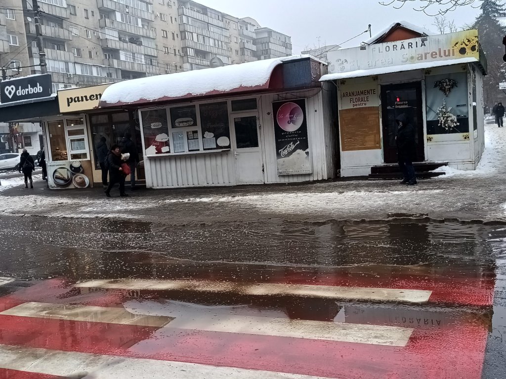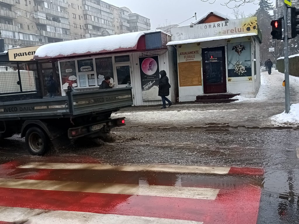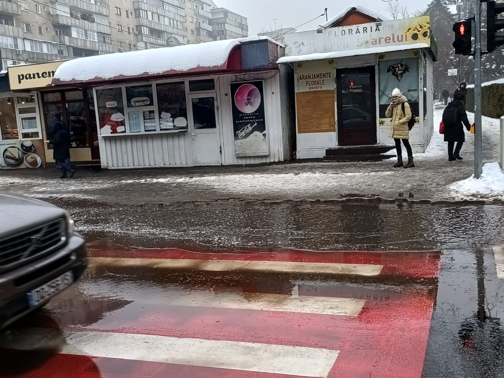 Fără rezultat însă. Poate doar acela de a-și uda ceva mai vârtos încălțările, ca să empatizeze cu cei care încercau traversarea în zig-zag. Ce mai. Pietonii scapă uneori de traficul aglomerat, dar în aceste zile la Cluj-Napoca sigur nu scapă de zeama de zăpadă cu noroi pe haine și papuci.