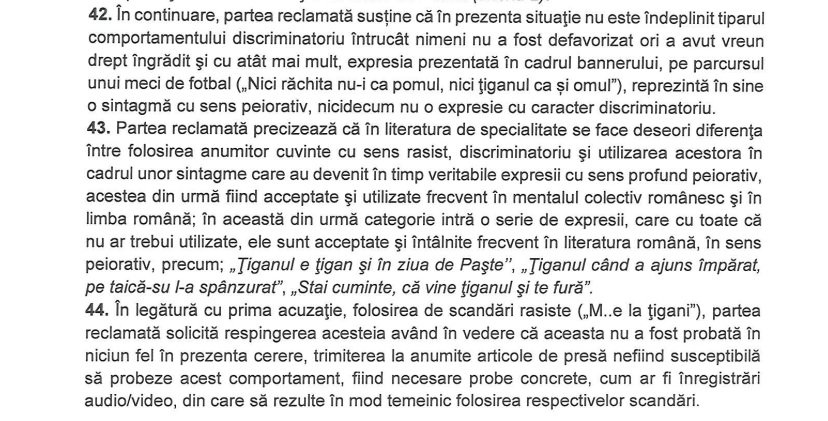 "Luând în considerare percepția negativă generalizată asupra membrilor comunității rome, Colegiul director apreciază că mesajul supus prezentei analize este de natură să instige la ură și intoleranță rasială, afișarea unui bannercu mesaj rasist reprezentândun comportament manifestat în public care lezează demnitatea persoanelor de etnie romă. [...]