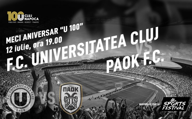 Clujul sărbătorește unul dintre cele mai vechi simboluri printr-un meci de gală. În 12 iulie, FC Universitatea Cluj întâlnește campioana Greciei, PAOK Salonic, cu ocazia Centenarului clubului clujean înființat în 1919. Partida are loc pe Cluj Arena, unde fanii sunt așteptați pentru a marca împreună acest moment istoric.