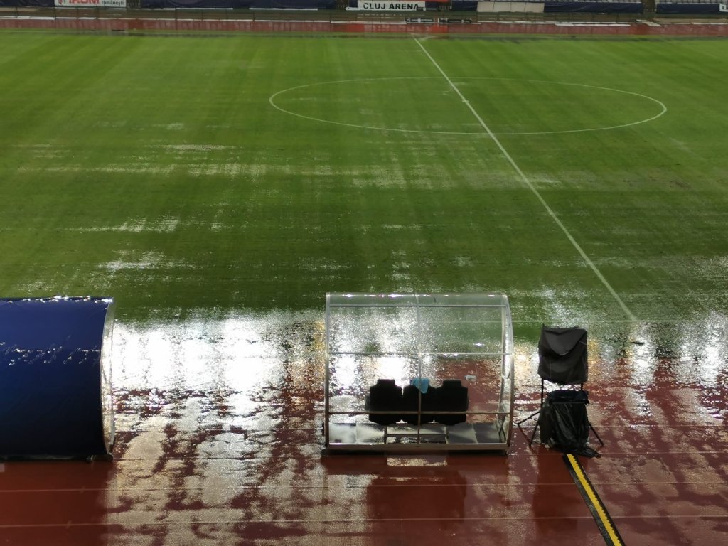Imediat ce prima repriză a meciului dintre Universitatea Cluj și Poli Iași s-a încheiat, primele picături de ploaie și-au făcut apariția.