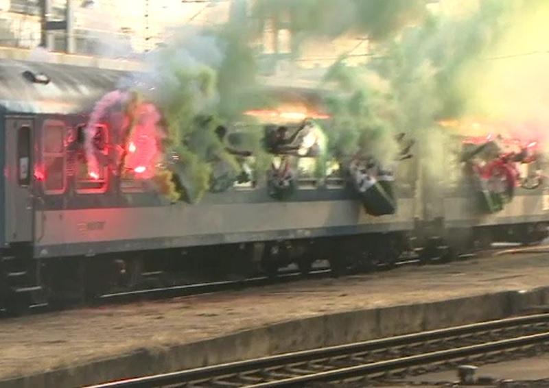 Sute de fani ai Ungariei au aprins torțe în culorile echipei naționale pe peronul gării din Budapesta, dar spectacolul oferit de aceștia a continuat și în trenul a carei locomotivă a fost personalizată cu chipurile fostelor glorii ale reprezentativei din țara vecină.