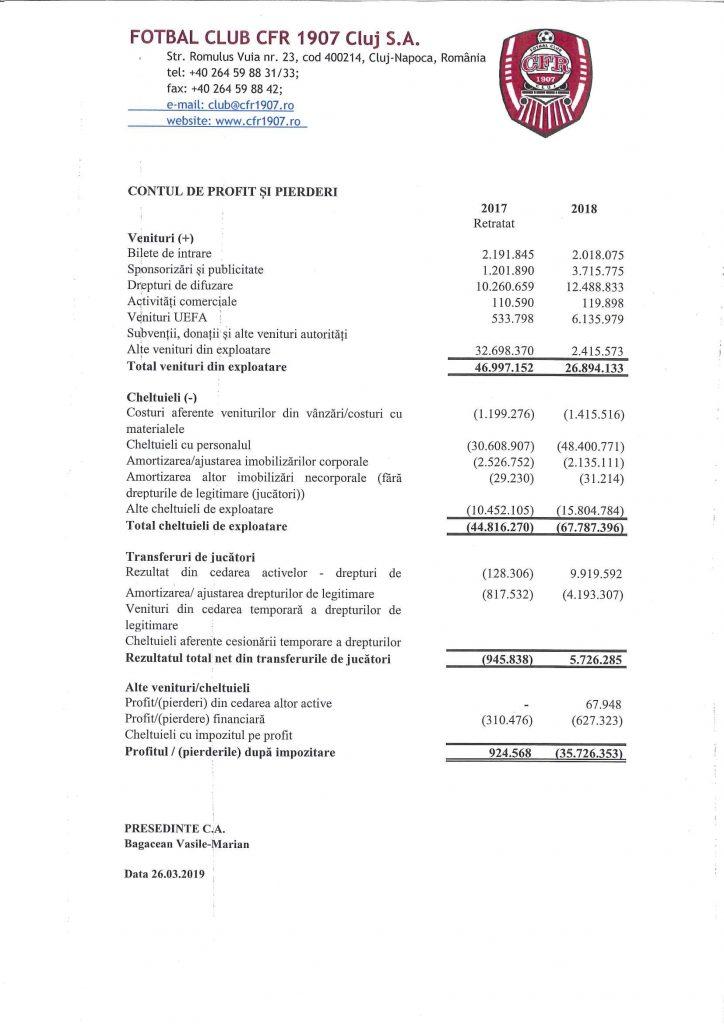 Obligată de regulamente să îşi facă publică situaţia financiară, campioana de anul trecut a raportat pierderi de 35.726.353 lei pentru anul 2018, arată documentele postate pe site-ul clubului.