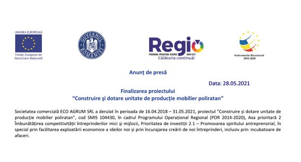 Societatea comercială ECO AGRUM SRL a derulat, în perioada de 16.04.2018 - 31.05.2021, proiectul "Construire și dotare unitate de producție mobilier poliratan", cos SMIS 104430, în cadrul Programului Operațional Regional (POR 2014-2020).