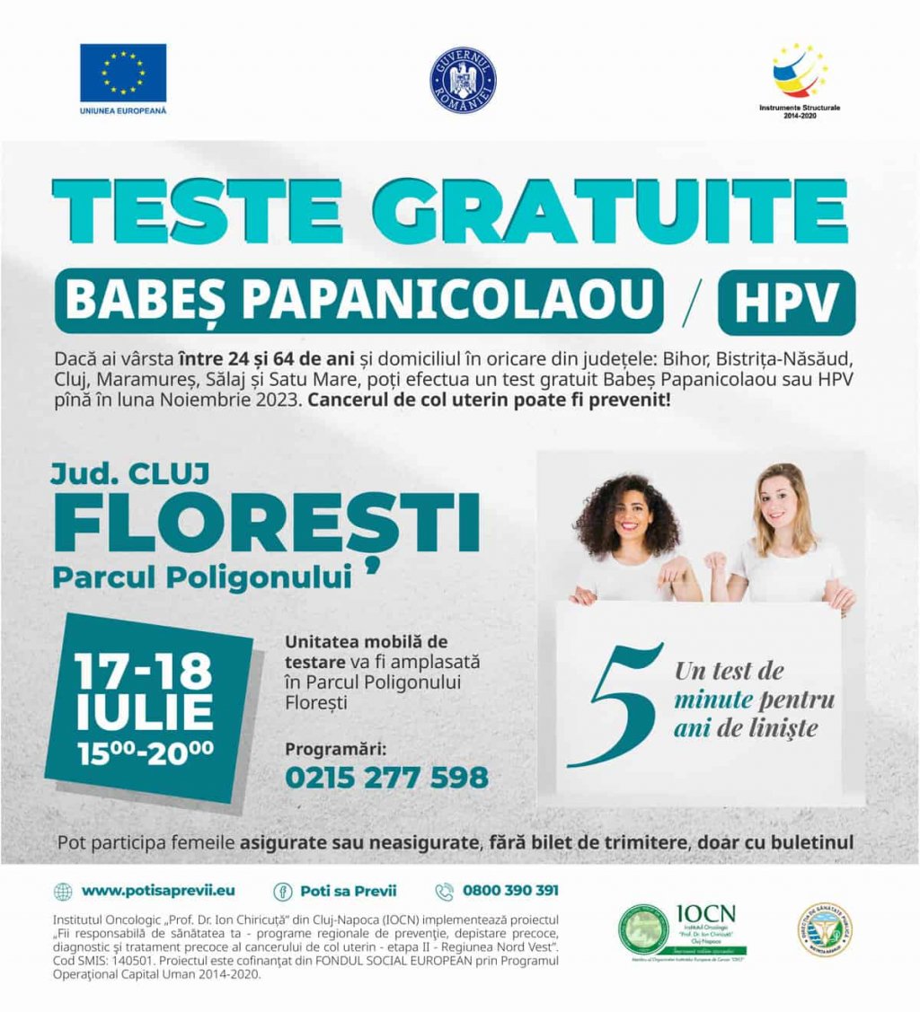 În zilele de 17-18 Iulie între orele 15.00-20.00 vă puteți programa pentru un test GRATUIT Babeș-Papanicolaou sau HPV la unitatea mobilă de testare care va fi amplasată în Parcul Poligonului, Florești.
