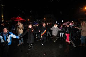 Sute de clujeni și oficialități s-au prins, miercuri, în horă, în centrul municipiului Cluj-Napoca, la finalul ceremoniei de marcare a Zilei Unirii Principatelor Române.