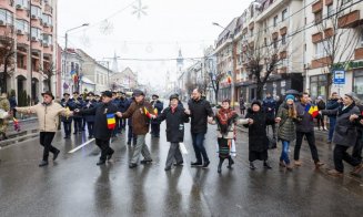 Sute de clujeni și oficialități s-au prins, miercuri, în horă, în centrul municipiului Cluj-Napoca, la finalul ceremoniei de marcare a Zilei Unirii Principatelor Române.