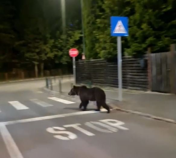 Un urs a fost filmat în timp ce se plimba nestingherit, luni seară, pe străzile din centrul staţiunii Poiana Braşov.