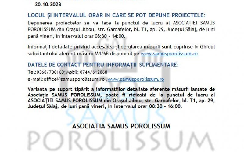 Varianta pe suport tipărit a informațiilor detaliate aferente măsurii lansate de Asociația SAMUS POROLISSUM, poate fi ridicată de la punctul de lucru al ASOCIAȚIEI SAMUS POROLISSUM din Orașul Jibou, str. Garoafelor, bl. T1, ap. 29, Județul Sălaj, de luni pană vineri, în intervalul orar 08:30 - 16:00.