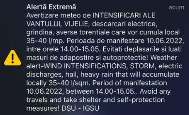 De asemenea, au fost emise mesaje de avertizare Ro-Alert și pentru terminalele mobile de pe raza comunelor Apahida, Cojocna, Ceanu Mare, Mociu, Cămărașu, Căianu, Cătina, Suatu, Geaca, Tureni, Pălatca, Aiton, Buza și Ploscoș, care, de la ora 14.00 și până la ora 15.00, se află sub COD PORTOCALIU de vreme severă.