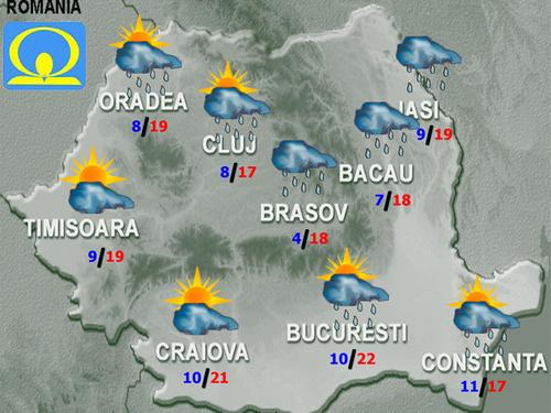 Marţi, vremea se va menţine în general instabilă. Cerul va fi mai mult noros şi va ploua în cea mai mare parte a ţării. Ploile vor avea caracter de aversă şi vor fi însoţite de descărcări electrice. Izolat cantităţile de apă vor fi însemnate şi vor fi condiţii de grindină. În zona montană înaltă, precipitaţiile vor fi mixte. Vântul va sufla slab şi moderat, cu intensificări în sud-est. Temperaturile maxime, în scădere faţă de intervalul precedent, vor fi cuprinse între 10 şi 20 de grade, iar cele minime se vor situa între 2 şi 12 grade.