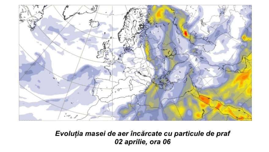 „La finalul lunii martie circulaţia predominant sud-vestică a favorizat pătrunderea unei mase de aer încărcate cu particule de praf de origine sahariană deasupra României. În perioada 1 aprilie ora 10 – 2 aprilie ora 22 se vor menţine particule de praf deasupra teritoriului României”, anunţă, luni Administraţia Naţională de Meteorologie.