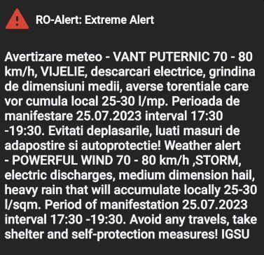 În intervalul 17:30-19:30 sunt anunțate: local vânt puternic cu rafale de peste 70...80 km/h, vijelie, grindină de dimensiuni medii, frecvente descărcări electrice, averse torențiale ce vor depăși 25-30 l/mp.